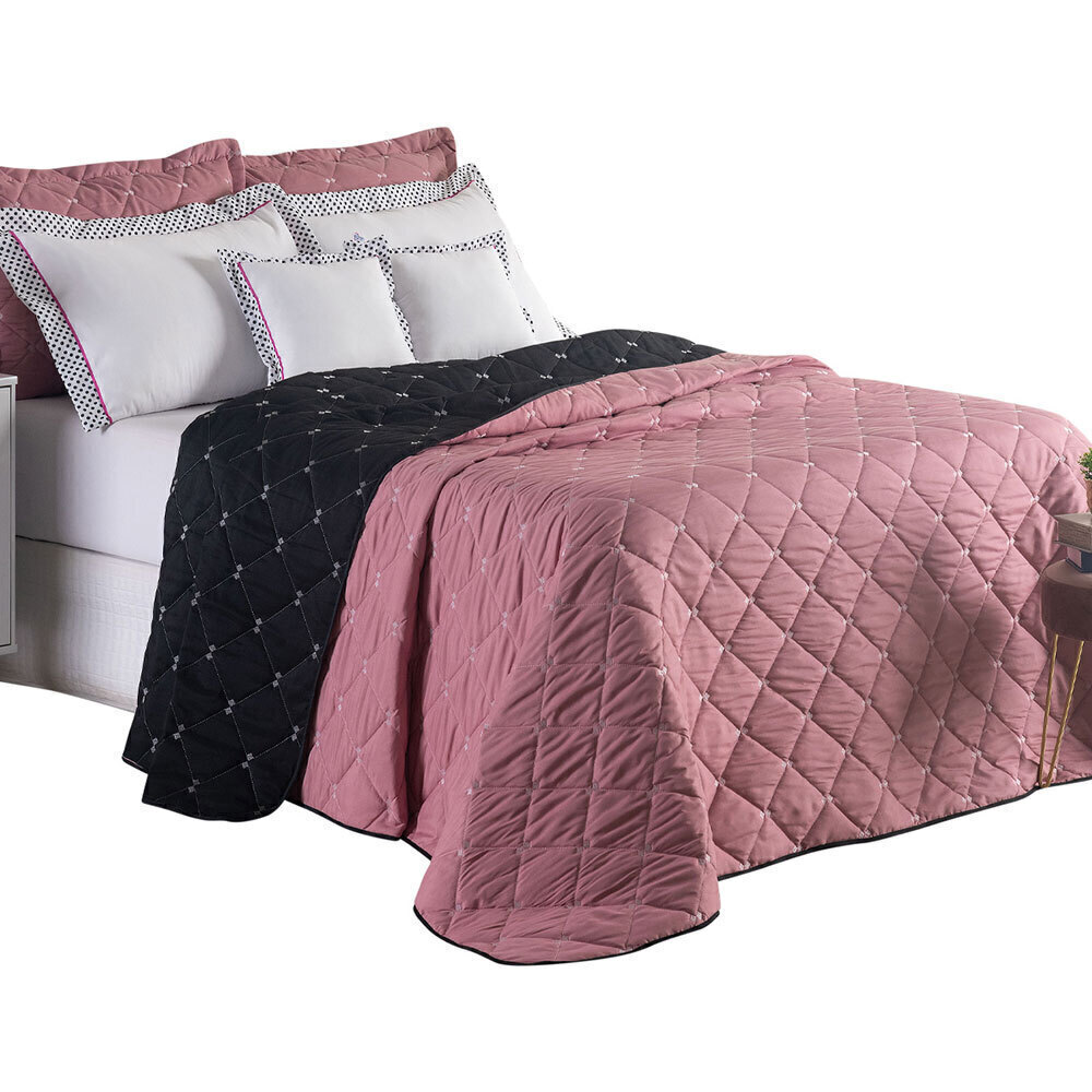 Este conjunto completo traz um cobre leito dupla face bordado, que permite mudar o visual do seu quarto com facilidade. Um lado trabalhado com bordados delicados e o outro com uma opção lisa, para que você combine conforme o seu humor ou decoração. Os porta travesseiros acompanham essa versatilidade, com zíper invisível em três lados, garantindo praticidade e sofisticação.